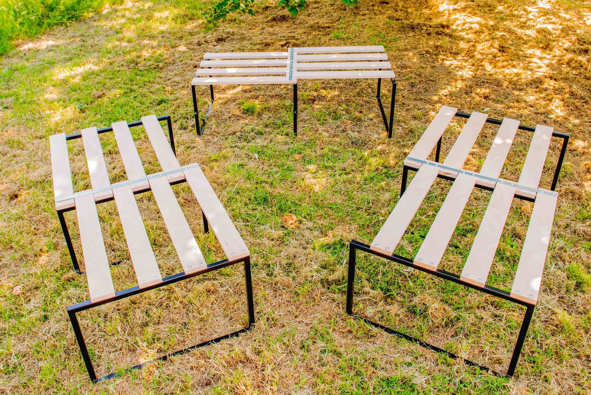 Der Rahmen besteht aus 20x20mm Eisenrohr, schwarz lackiert. Der obere Teil besteht aus einzelnen 18mm starken OZIGO-Sperrholzlatten.